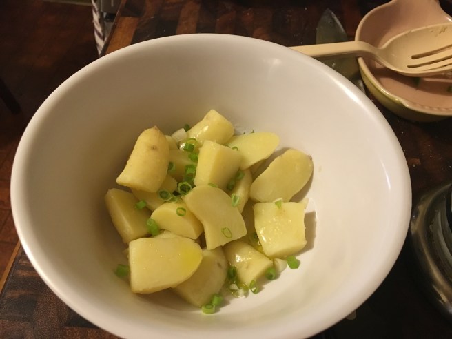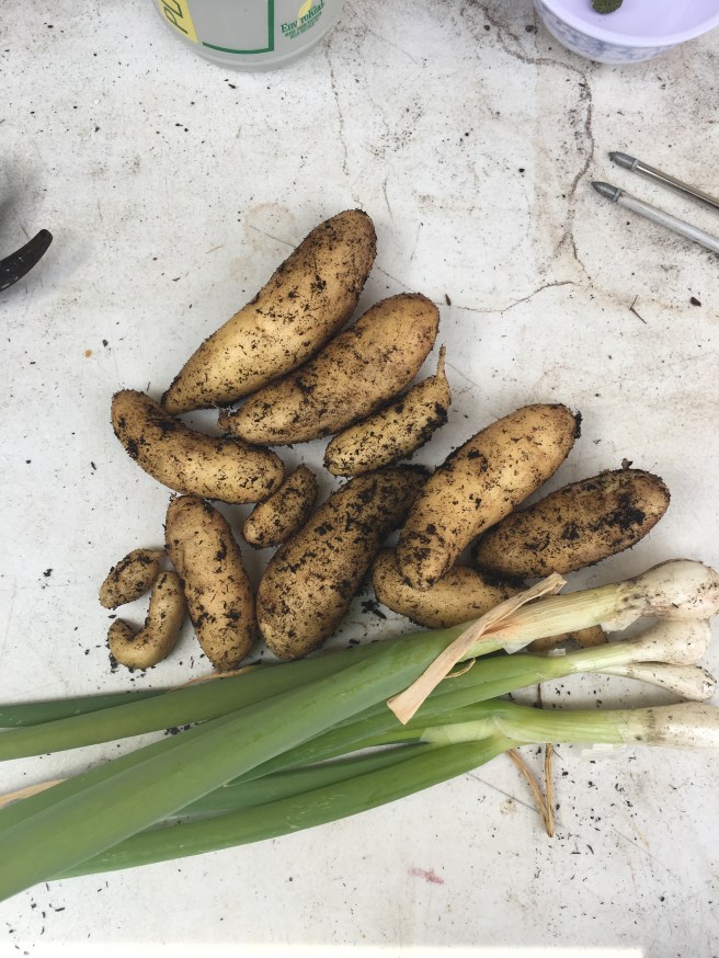 These are the Russian banana fingerling potatoes. And some scallions. This variety is meant to be eaten as new potatoes, so I had to cook them right away.