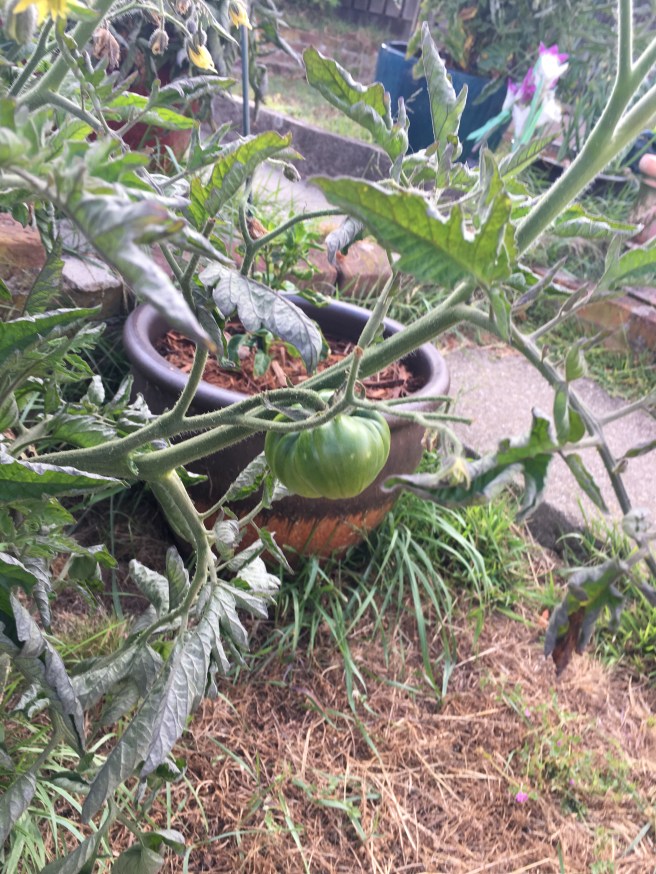 Lastly- my one big Roma is ripening nicely. It’s been cool-ish, but on the warm side of cool-ish, and this baby tomato lived through the heat wave so it looks quite nice.