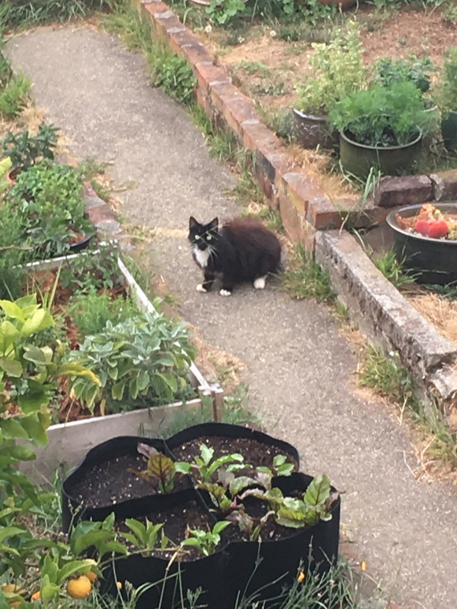 Speaking of pirates- I have some new feline invaders. This is a lovely tuxedo cat that comes around from time to time, and is apparently female, not a tom as previously assumed, as she’s toting around two fat little kittens that were too fast to photograph from my window. I nearly tripped over them today while watering, and they cartoonishly flung themselves over the fence to get away from me.