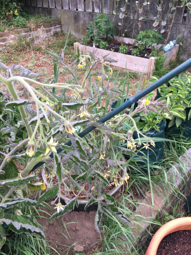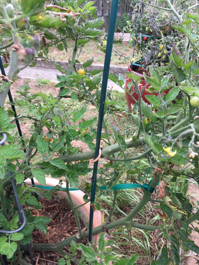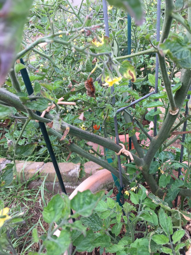 The only tomato that seems to have been fully ok with its initial staking system is the sweet 100- which has obediently grown inside it’s rusty old tomato cage.