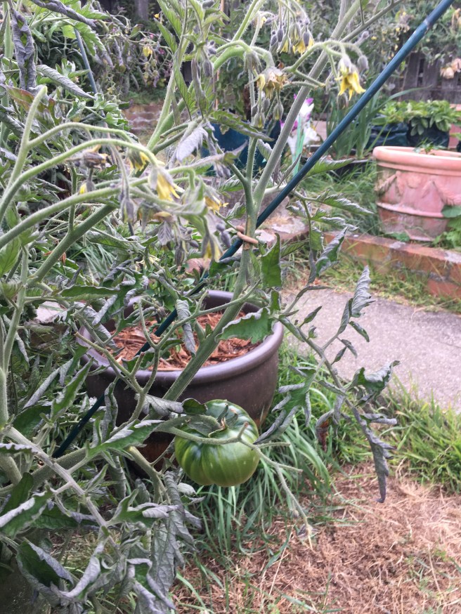The San Francisco fog is just starting to set out fruit and it was always a gerry-rigged system. It’s got two stakes and a hoop which have proven inadequate so now it has a diagonal stake trying to help matters.