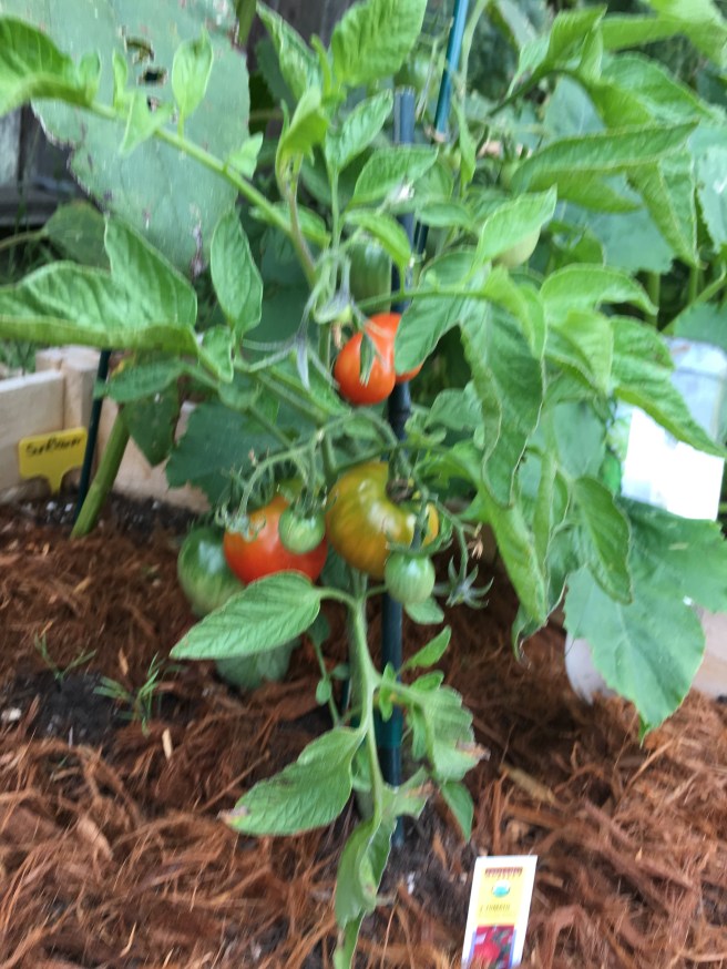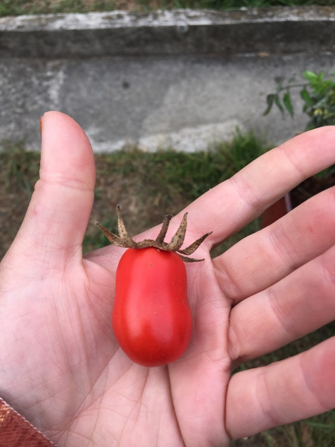 My incredibly awkward system of four stakes and vinyl tape encircling said stakes is maybe not the prettiest thing in the world but I’ve done something right- as I’ve gotten my first ripe tomato that wasn’t a sun gold.