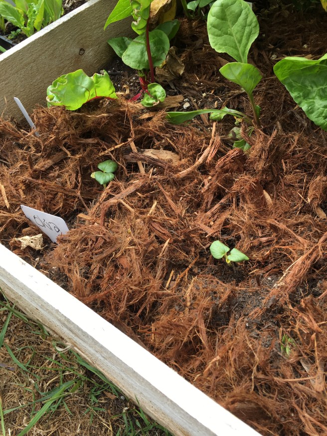 First, an experiment. These are some okra seedlings. I have five in total, and they have not been doing well in their seedling 6-pack. So despite being runty I’ve transplanted them, and hopefully if I water them with tappin roots tomorrow they won’t die. This makes this bed a very mixed bed of blue lake green beans, Swiss chard, and now okra. I mixed some extra bio-fish into the soil to give everything a boost, and we’ll see how it does.