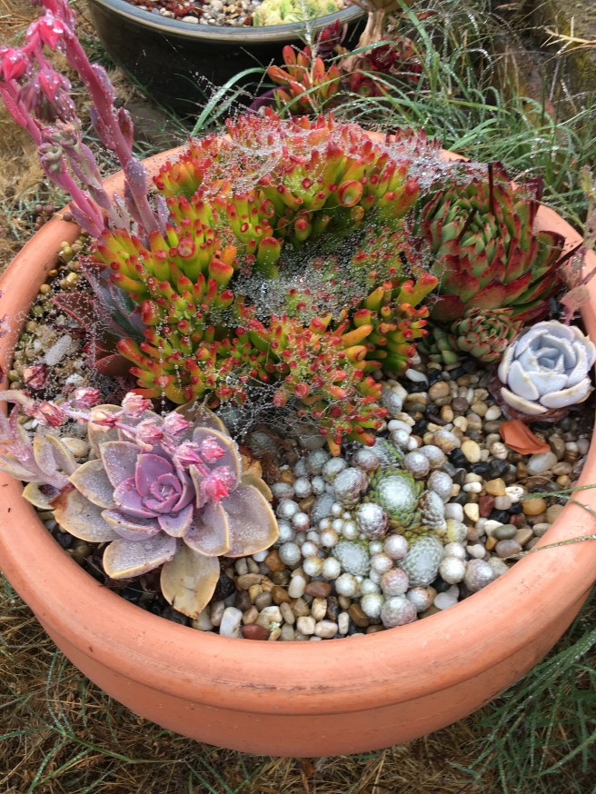 It seems my succulent pot is hosting a spider convention, judging from the dewy spiderwebs. Oh well, they live in the back too.