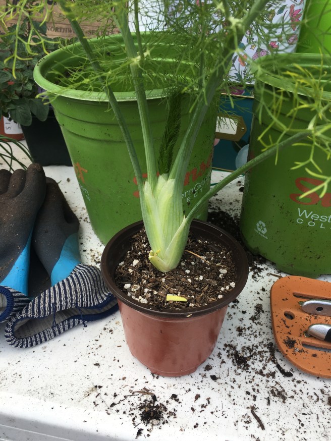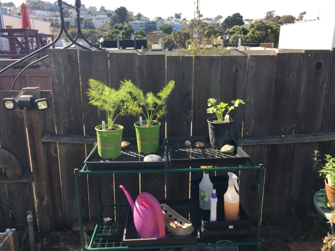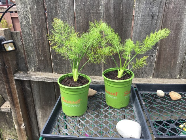 Now while the celery will probably have to graduate to a bigger pot, Mr and Mrs Fennel can probably stay here till I’m ready to eat them. Fennel is funny- put them in the same pot and they’ll go to seed instead of produce a bulb. You have to either space them a foot apart in a bed- not ideal for an urban garden- or give them their own little pot to live in. As tasty as their fronds are- I like to cook with the bulb!