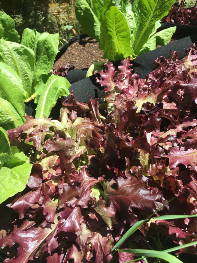 My lettuce also was going the way of the chard. It’s very close to the house and gets plenty of cover, but the heat and the morning sun was extremely hot. So more water in the fabric bed as well.