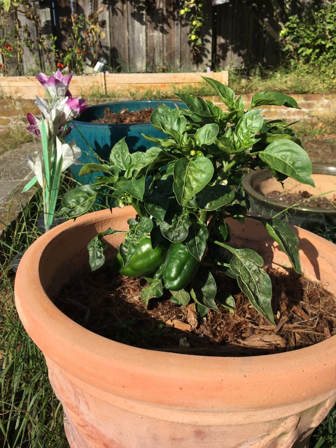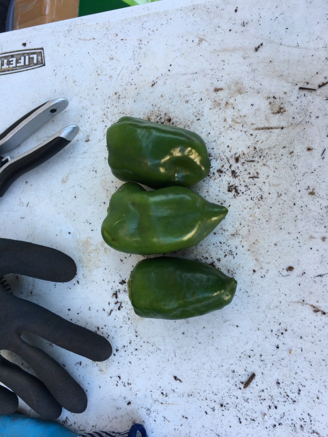 Look at those nice big green peppers. Now lipstick peppers are generally picked at the red stage, but even with our heat wave there is no guarantee they’ll get that ripe, and I just wanted to check for texture anyways.