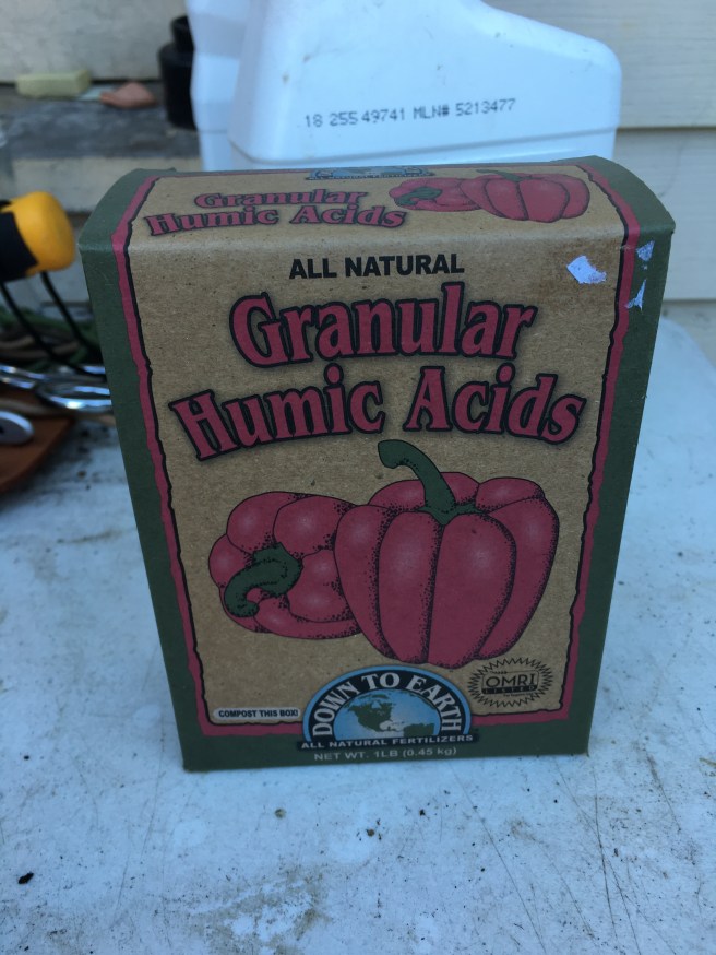 Part of the problem seemed to be that nutrients were going nowhere, so I tried something a little interesting. Granular Humic Acids are a soil additive that (supposedly) helps with nutrient uptake. This is not even remotely settled science, but anecdotes support it, and it isn’t too expensive so why not.