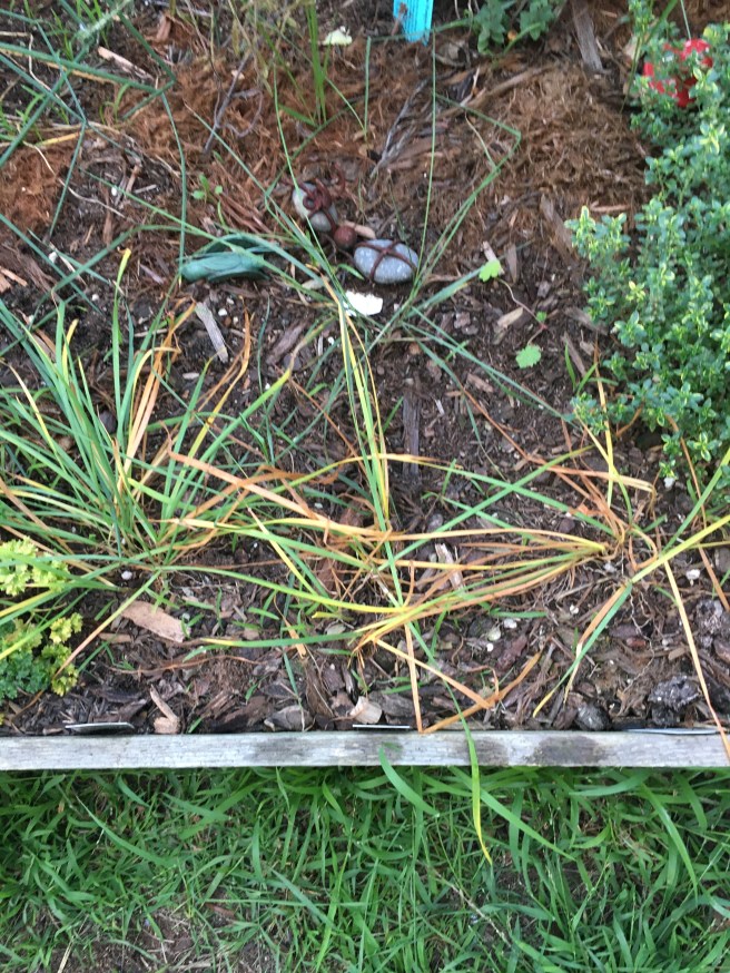 Now- I watered well, but it was not enough. As you can see- my garlic chives bit the dust. Also my yerba buena, most of my tarragon and half my parsley plants.
