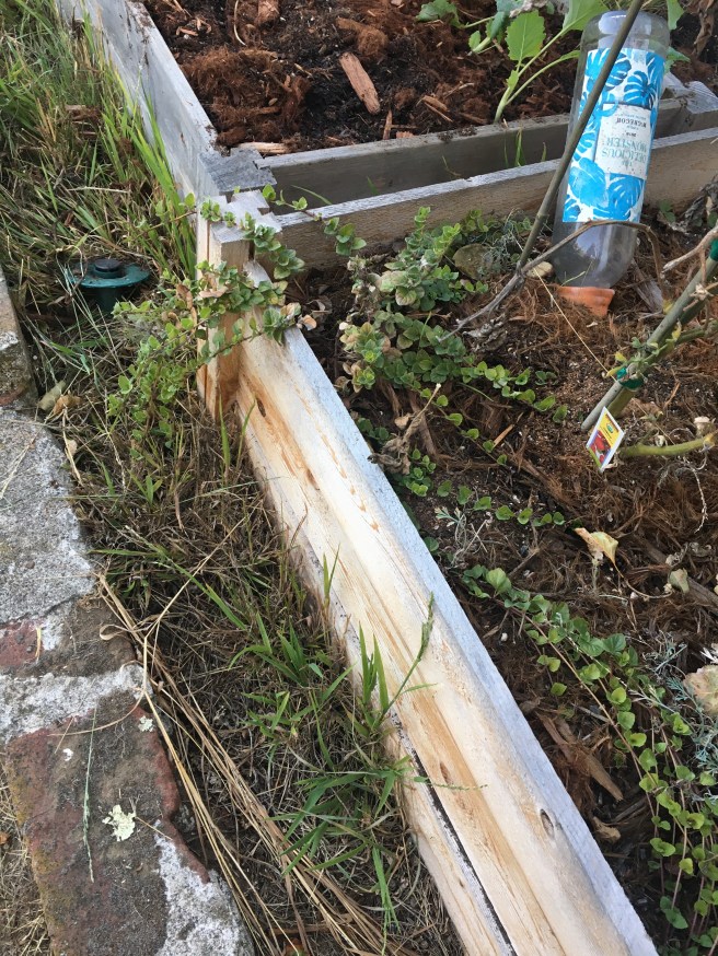 This scraggly but healthy fellow is my other Yerba Buena- which I planted in front of some tomatoes and sunflowers, now dead in situ as I figure out what I’m going to do with the darn bed.