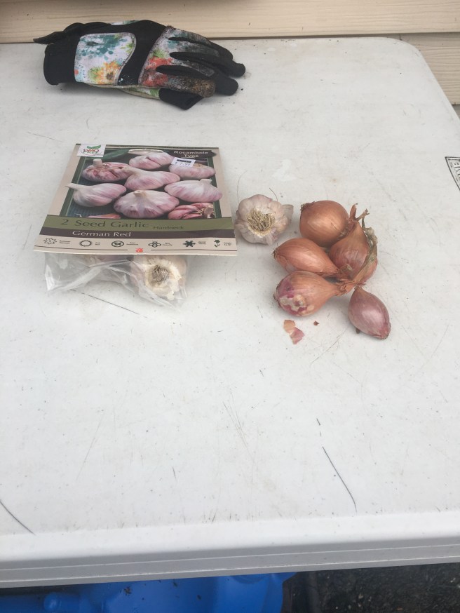But as past disasters have taught me- you can’t just put store bought garlic in the ground. So seed garlic it is. I also have some seed shallots but there wasn’t room the day I went garlic planting.