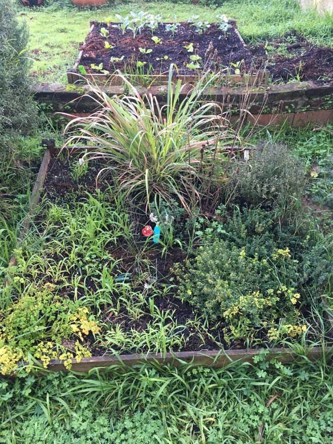 Well the shade herb bed is just a mess. It’s not even a productive mess it’s just a mess. The thyme has gone all woody and the parsley has bolted- but the lemongrass is healthy at least.