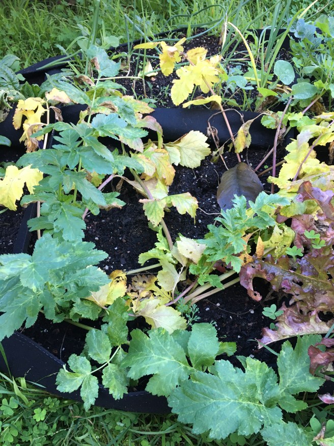 The fabric bed that is just annoying got so washed out that everything that wasn’t already a mess is turning yellow. I’m just waiting for dad to come home from PT rehab so I can pull all the parsnips for stock and junk the bed for something more sturdy. They of course are root veg, and therefore at this point the yellowing leaves isn’t really an issue. Still aggravating.