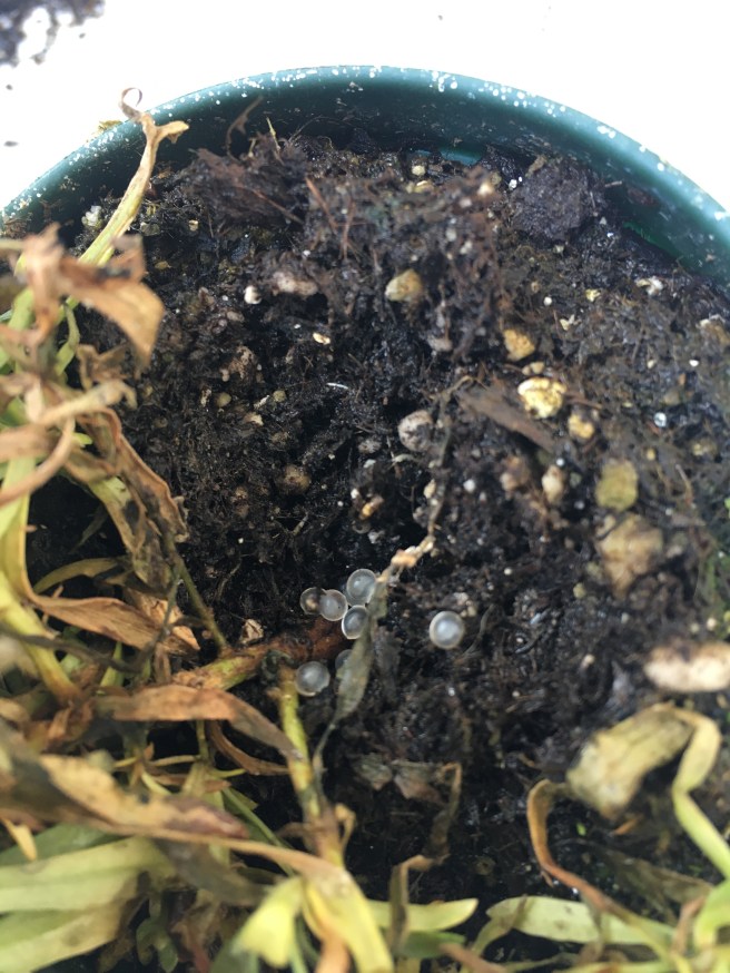 Speaking of common garden pests, I finally started the process of re-potting my slightly drowned baby tarragons and… nope. Nope nope nope. Those right there? Slug eggs.