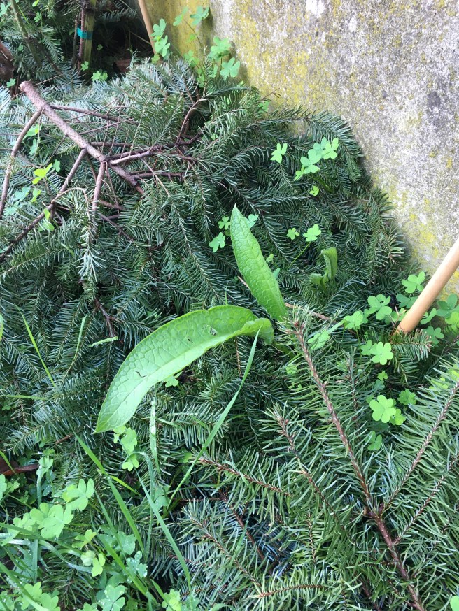 I wanted to end on a high note. This is the base of my blackberries, protected by fir needles. And that is a re-sprouting comfrey creeping out from underneath. It’s alive! So my green mulch/bruise salve dreams are back which is nice.