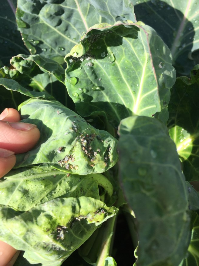 This is my first year growing Brussels’s sprouts. This may be my last year growing Brussels’s sprouts. The cabbage aphid issue is bad this year, no doubt like the scale being spread by ants. I also dusted the top of the Brussels with diatomaceous earth, as well as a good spray of insecticidal soap. I swear I’ll get sprouts from these guys if it kills me. I love sprouts!