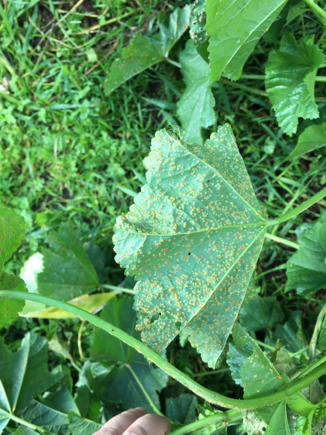 Anyway, the ‘scale’ on your cheeseweed is an infestation of rust. It is fungal pathogen that is common on cheeseweed, but may affect nothing else in your garden. It, or perhaps another type of rust, can be a problem for okra, and is often a problem for hollyhock.