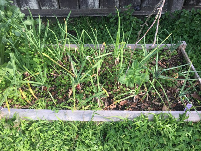 Looks like when I cobbled together the dirt to plant the onions a fragment of seed tater snuck in. Now that it’s pouring it decided it’s time had come and sprouted.