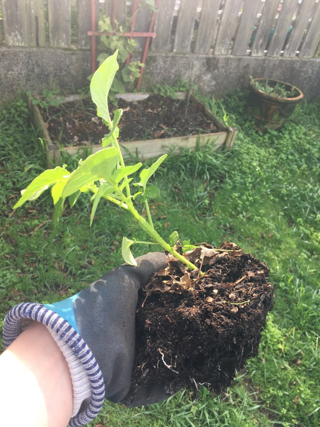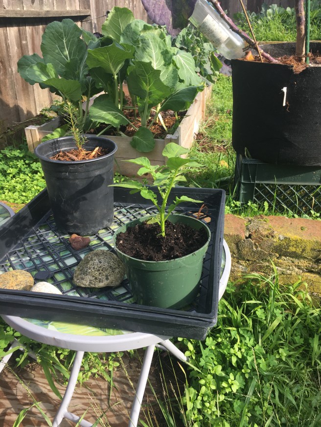 I set the little buddy in a sunny spot, and if he keeps growing I’ll pop him in a bigger pot or in one of the vacated potato bags.