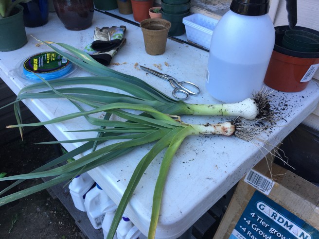 Anyway- as I was moving things so I could trim the grass I decided to harvest the leeks in the last leek pot. It was mostly weeds anyways, and leeks are good.