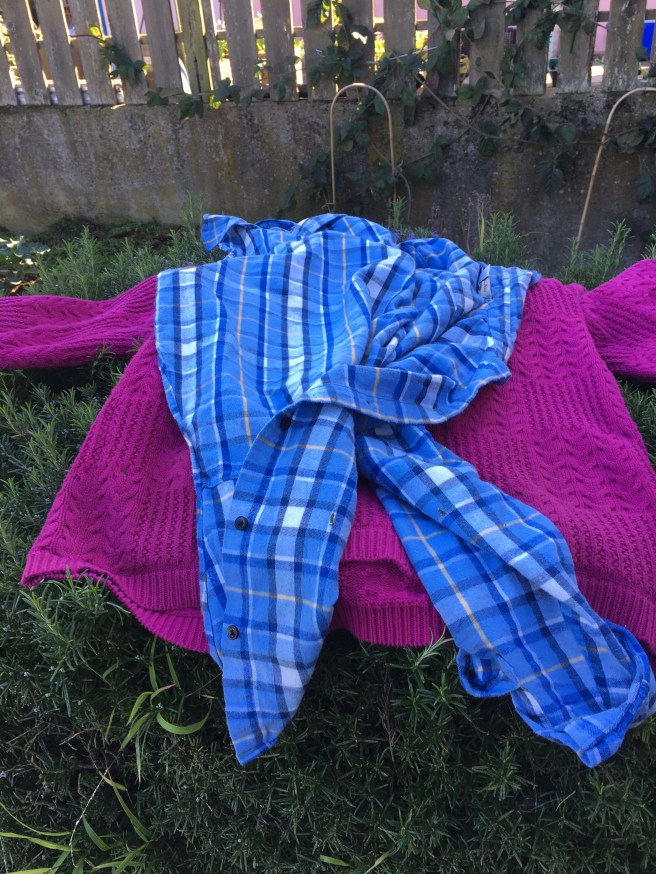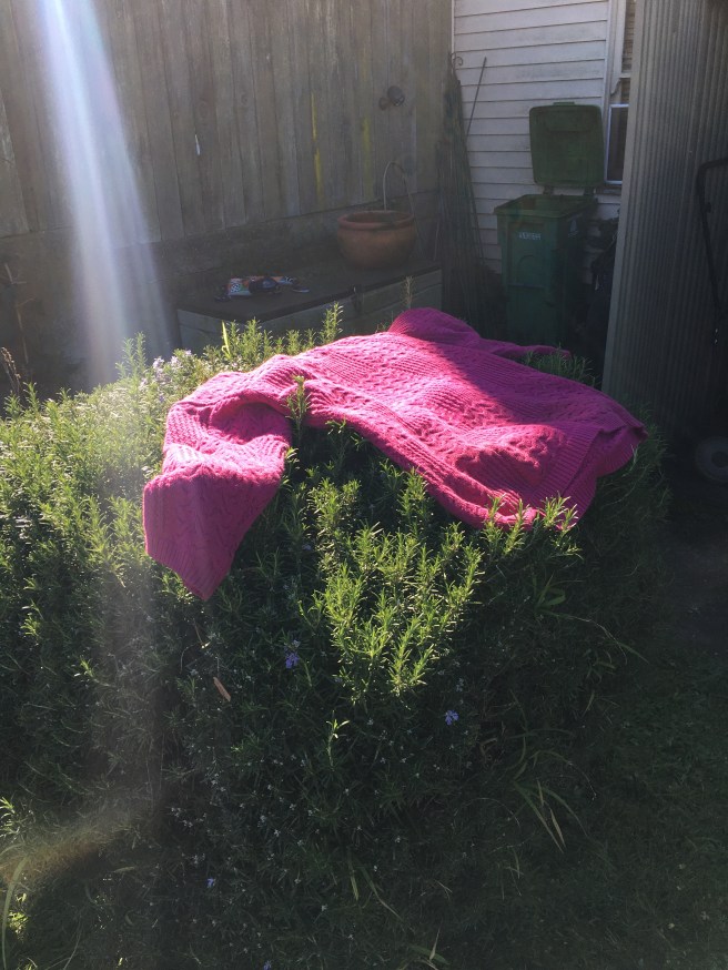 At this point I was hot so the magenta sweater of destiny got to go chill on the rosemary bush and get perfumed.