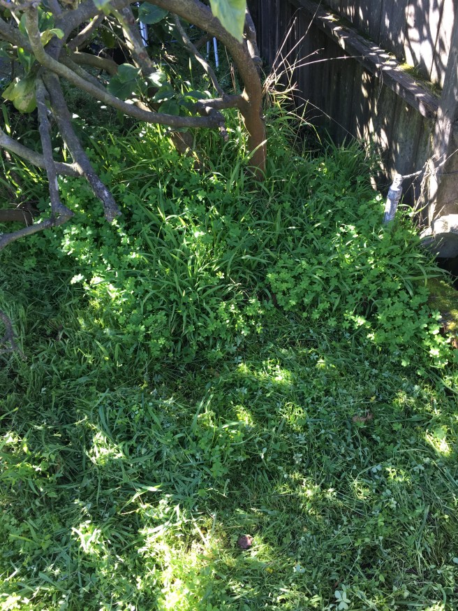 I kept at it- trimming behind the beds in the back, around the apple tree- moving pots and bags and milk crates.