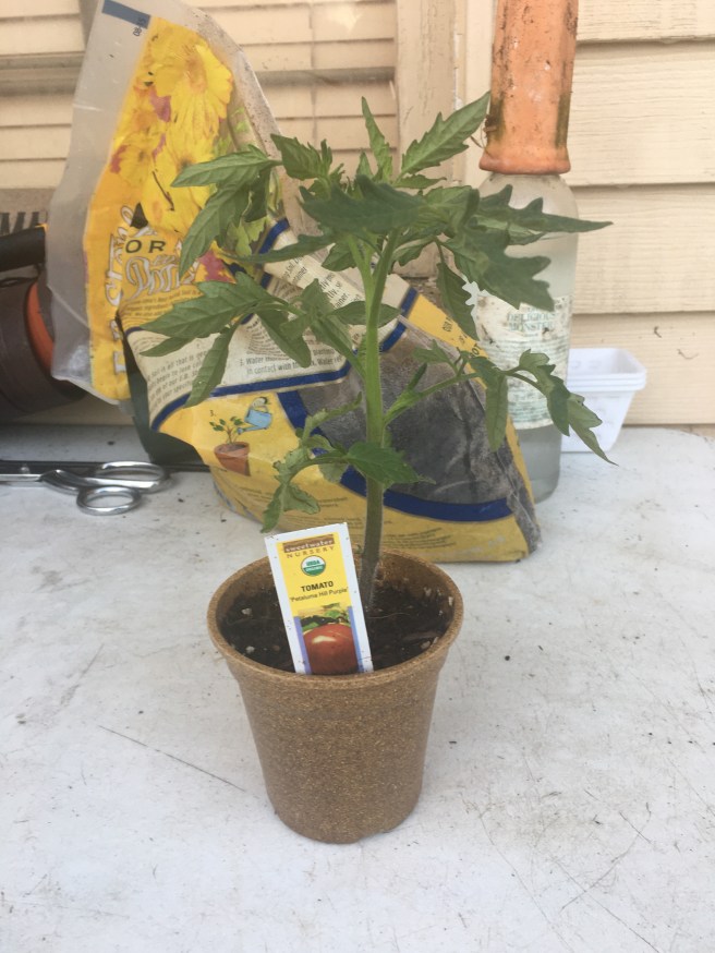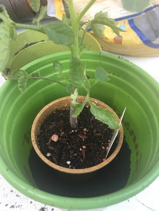 I didn’t bury it as deep as you would in a permanent home- it only has so many leaves at this tender age. I did pinch off the two bottom ones though.