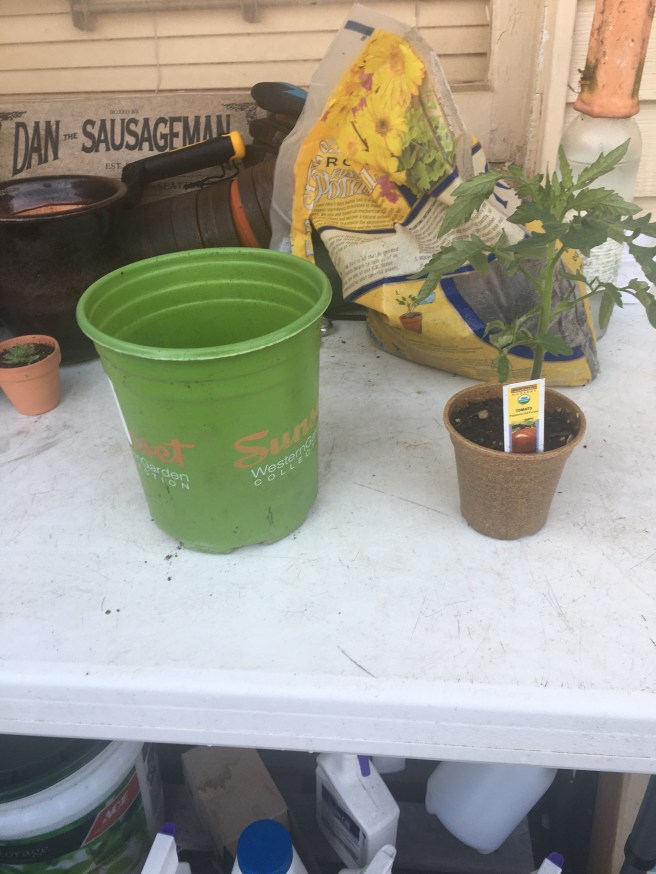 See the way I figure it, it’s too cold at night for a tomato. So I’m going to get the good rich soil and pot it up in an old gallon, and take in at night!