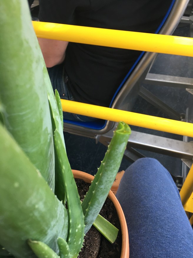 So then I tried to give the plant it’s own seat. The bus wasn’t crowded so I was hardly taking room from a person. You can see how the plant is sort of budding new aloe all around it. It’s a wonderful plant. But of course near Parnassus we sort of jerked and…