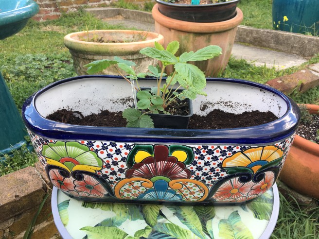 The plant itself was fairly vigorous for having been rained on for a weekend so anticipating lots of runners I put it in the wider fancy pot so it can grow as sideways as it needs too.