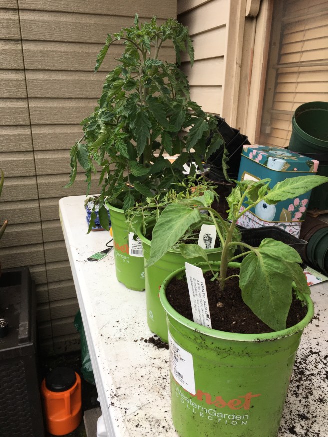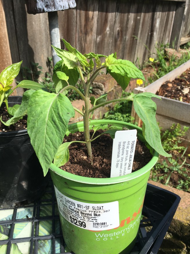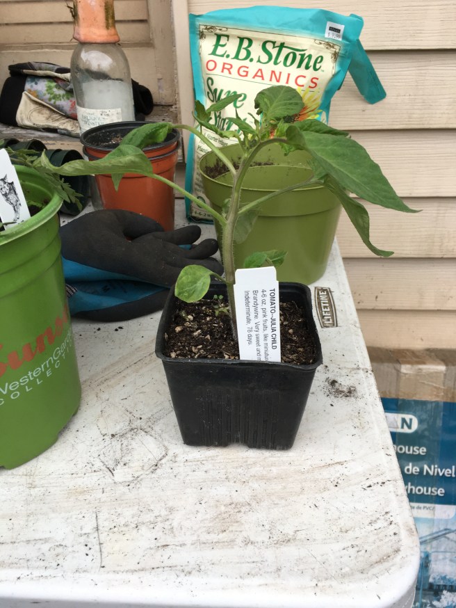 And the heroic line-up! It’s funny how different the leaf shapes are! The Petaluma hill purple looks like a bog-standard tomato- the Spike looks like an alien plant, and the Julia Child looks almost like a pepper plant!