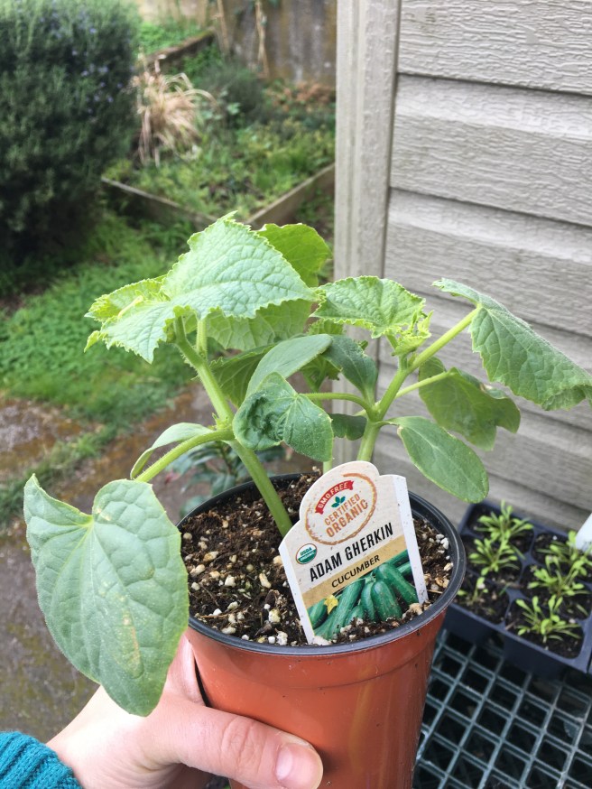 It’s actually three plants in one pot. I’m starting some cukes in transplant pots but this will give me an early start. Unlike squash that absolutely hate wet weather and get mildew at the drop of a hat- cucumbers are more moisture tolerant so you can plant them earlier in the season than summer and winter squash.
