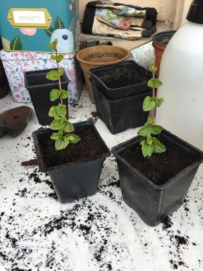 While working the bed and pushing aside the Yerba Buena I broke off a couple of stems.