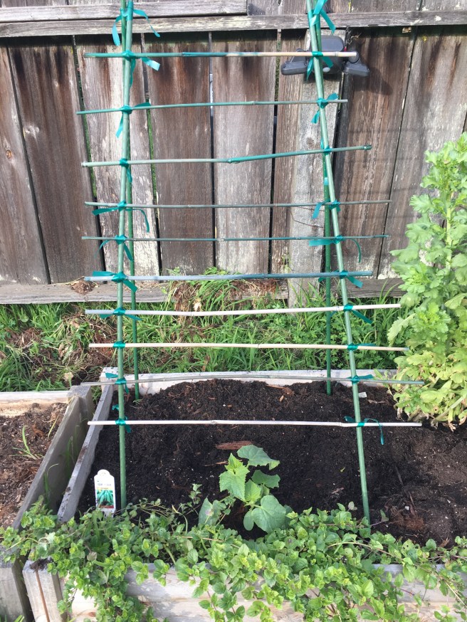 This way as the three plants grow I can train them to the sides, and since the trellis is at an angle hopefully when the plants bear fruit it’ll hang down and be easier to harvest.