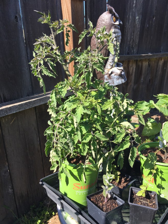 So my initial way-too-early tomato, little miss Petaluma Hill Purple is… way too big for her pot.