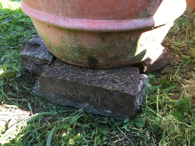 Not only did I scrounge up some old bricks and carefully position it- I used some screens for the holes in a (vain) attempt to hold off bugs.