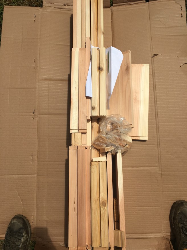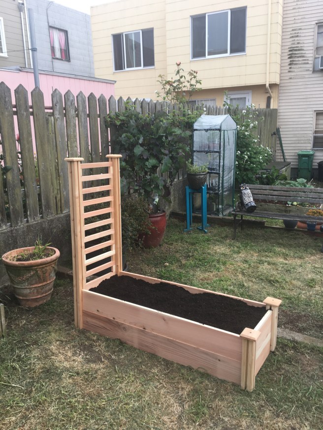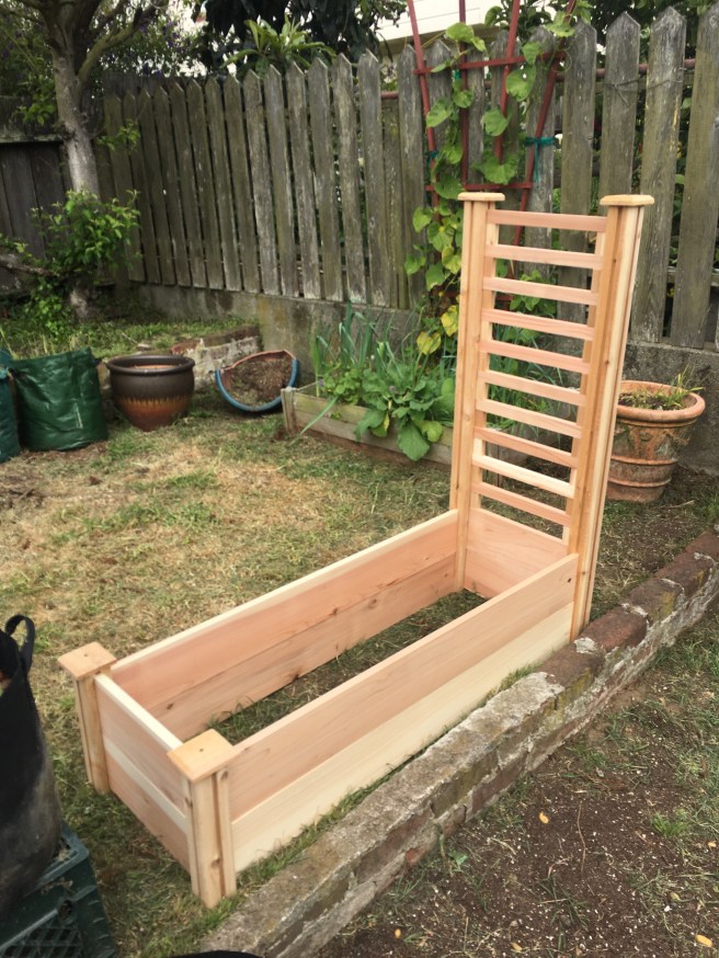 I swear to god by this time last year I was drowning in cucumbers and the fact that I’m not this year is a sin against me and nature. So instead of my lovely homemade trellis which will hopefully be fine for some squashes- I now have this beauty for my cukes, which as it’s cedar, should repel everything and anything that would eat my beautiful babies.