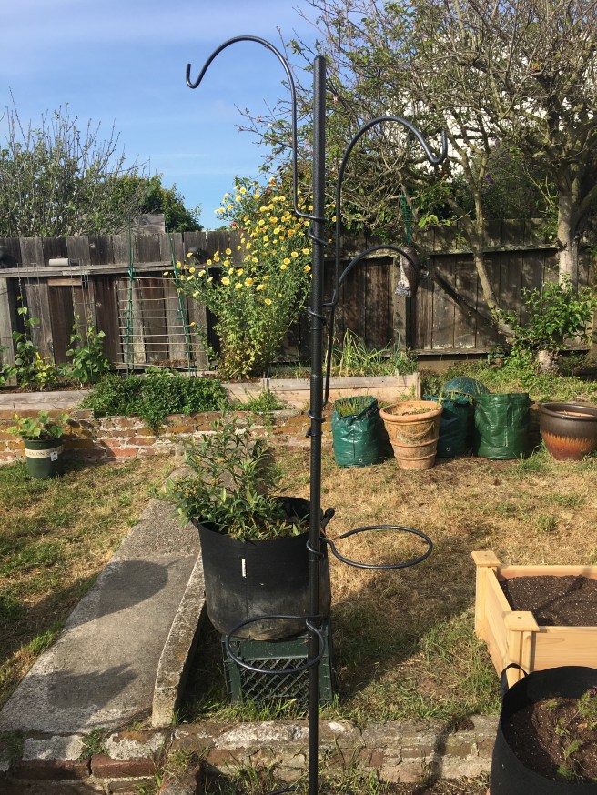 It’s a super simple set up. The center pole is in three segments that screw together into each other and a wide base. The bottom two rings can hold pots set into them, and the hooks hold hanging baskets.