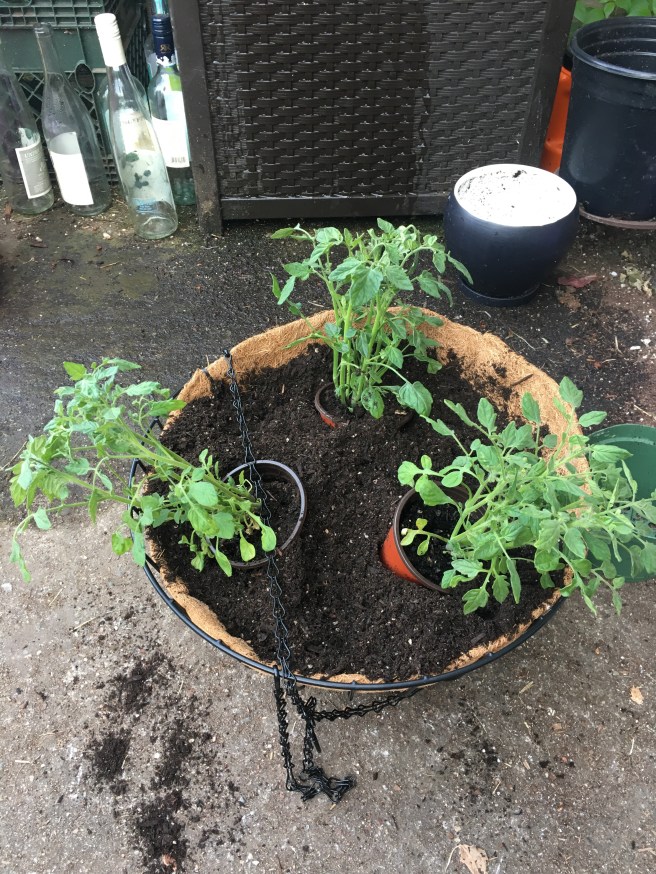 The idea is to sort of space them so that when they start getting very tall they’ll droop over the sides. This type of tomato was bred with this in mind so I’m hopeful.