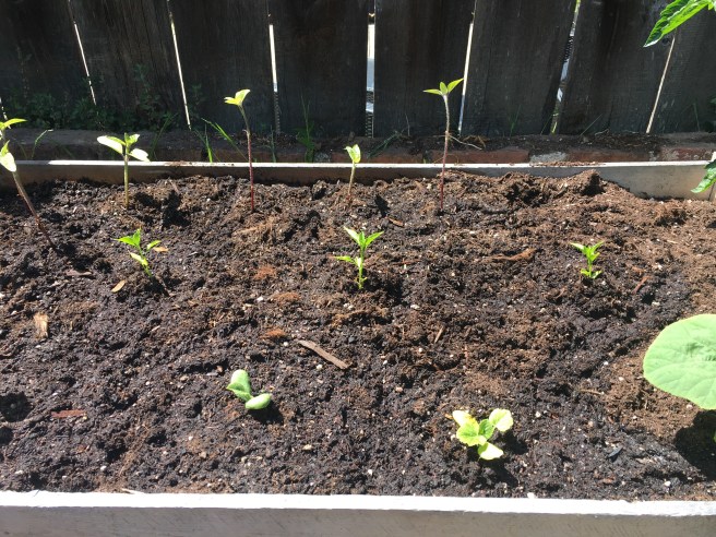 The seedling table has thinned considerably, as I have slowly filled up the front metal bed with lettuces and spinach, and the trellis bed with cucumbers and swiss chard. The red kuri went in front of the beans, and all the tomatoes are in their thickets.