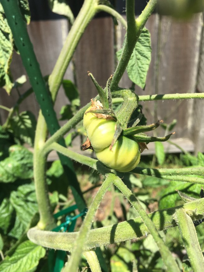 Meanwhile the mess that is Spike is just LOADED with baby fruits. This little weirdo beauty that was marketed as a “Star Trek” tomato is prolific enough already that if they are delicious as advertised I’ll buy 4 plants next year. The proof of course will be in the tasting… also it’s an open-pollinated variety so saving some seed from one of these fruits could be fascinating.