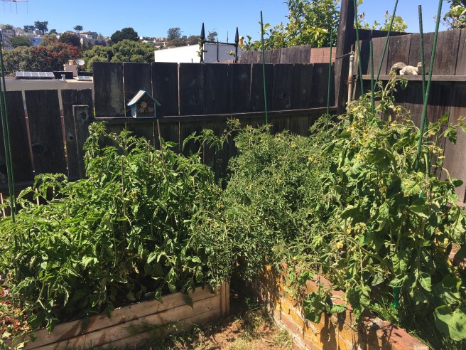 Here’s a wide shot of the tomato corner. As you can see my goal of being neat and tidy this year has completely been missed because I have no patience or executive function for pruning or general neatness. As this seems to be working in my favor I will claim it was my plan all along.