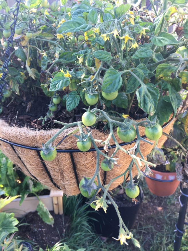 Even the lightly fungal-y hanging cherry tomatoes are heavy with fruit- but as a cherry type that’s not surprising.