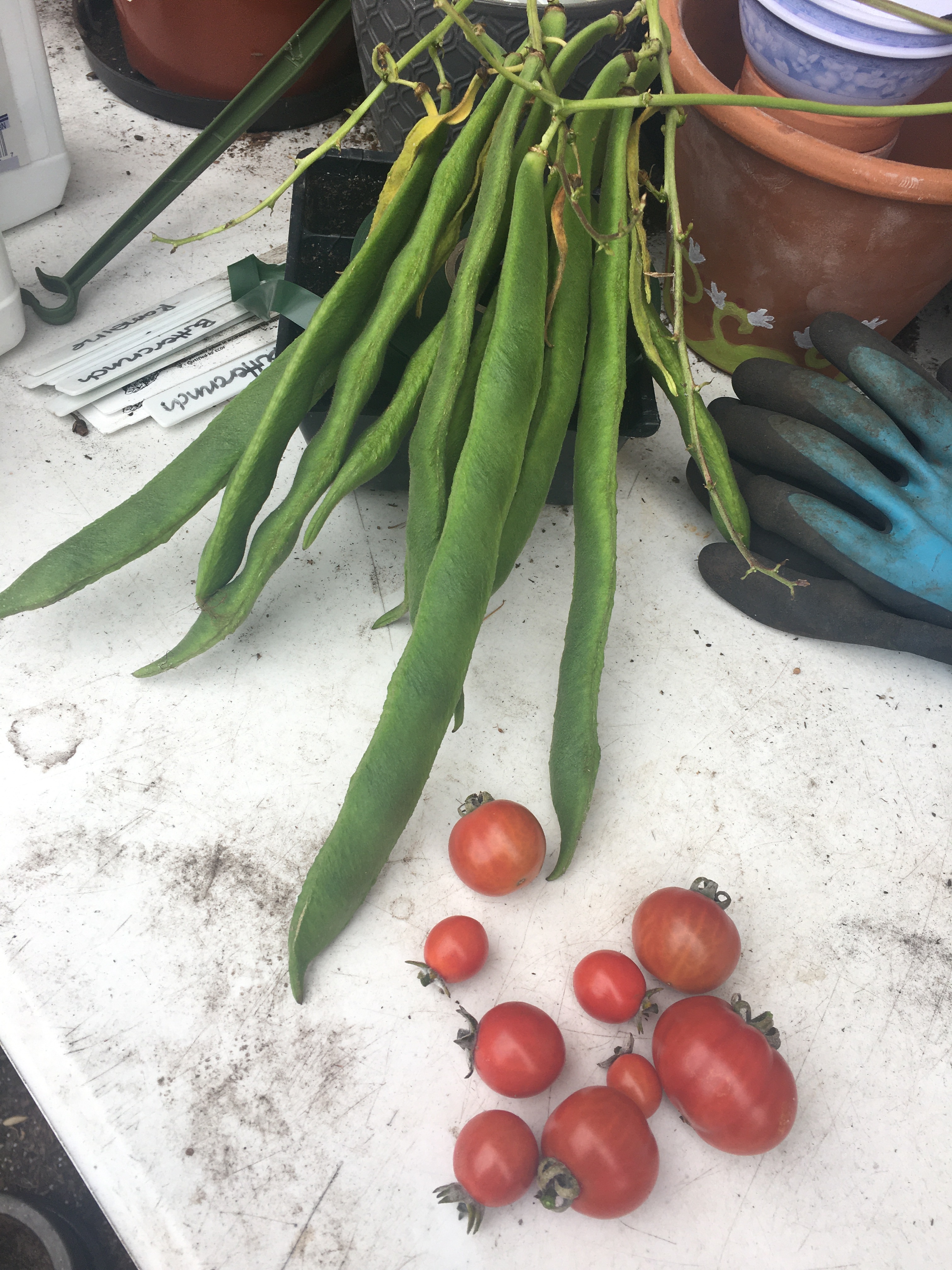 This is a beautiful and aggravating picture. The tomatoes are beautiful- the beans are aggravating. See- I’ve never really grown anything but green beans and snap peas. Therefore I did not know that there was a point where a runner bean crosses the line forever from “green” to “dry and shell me”. Those tough fibrous pods? I washed them and boiled them like I would a romano bush. Was not expecting that half of it would be completely inedible fiber.