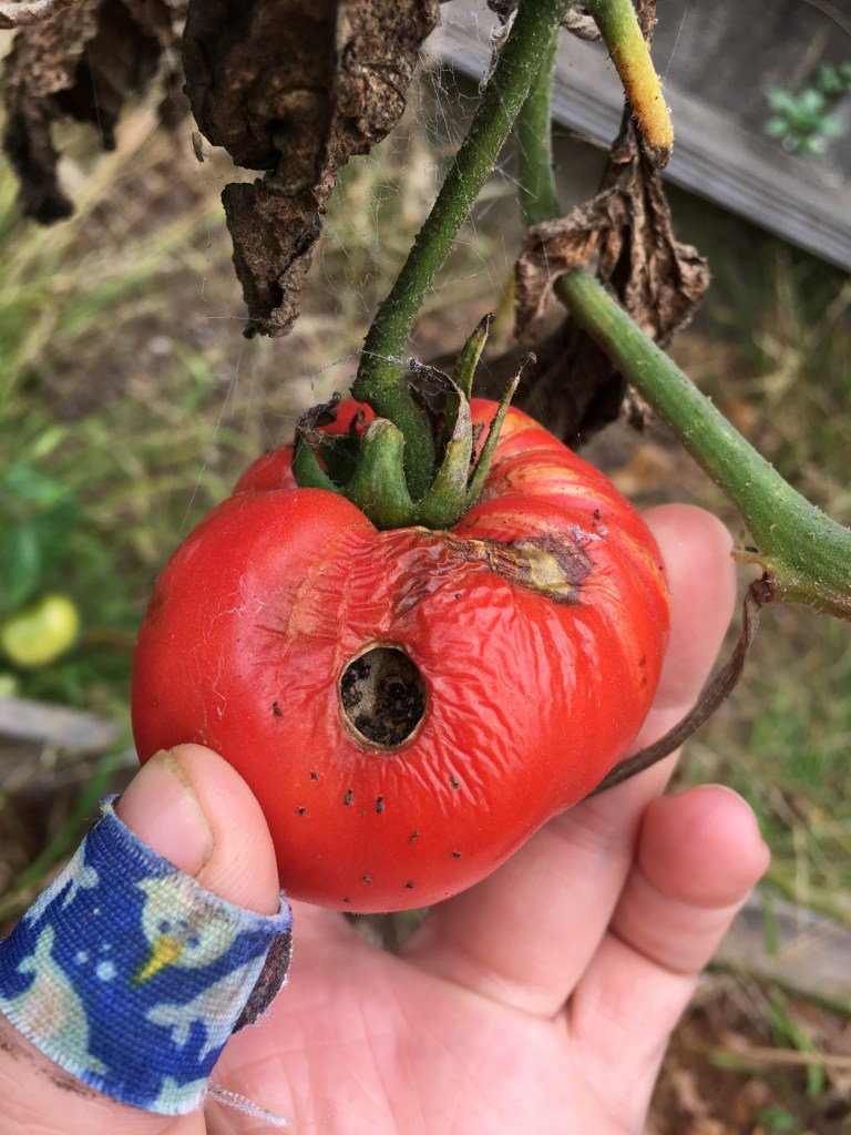 I’ve already been gushing about the Spike- and that was a real dark horse in terms of yields, if not size. The small stature wasn’t a surprise, Spike is sold as a 1oz tomato- bigger than a cherry, but not by much. They are a real winner in the taste department though I am happy to say. The hanging gardens is also doing well, though the poor plants are on their way out- the powdery mildew was a killer this year. That again, not a huge surprise, cherries are good performers. Julia Child and Petaluma hill purple were disappointments but that’s much more due to my issues not finding stakes and putting the purple in a pot. and possibly some bug/fungal issues with the Julia Child fruit rather than just the vines.