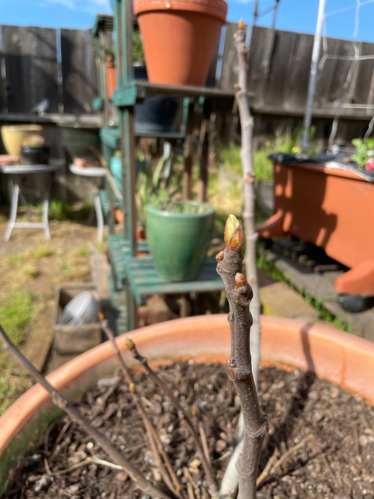 Possibly my wackiest addition to the garden but something I’m very happy to have is my dwarf fig tree. It was bought and planted too late in the season last year to give me edible figs but it did fruit, so at least the birds benefited from the under ripe bounty. But I pruned it well while dormant, and it’s growth tips are just starting to unfurl.