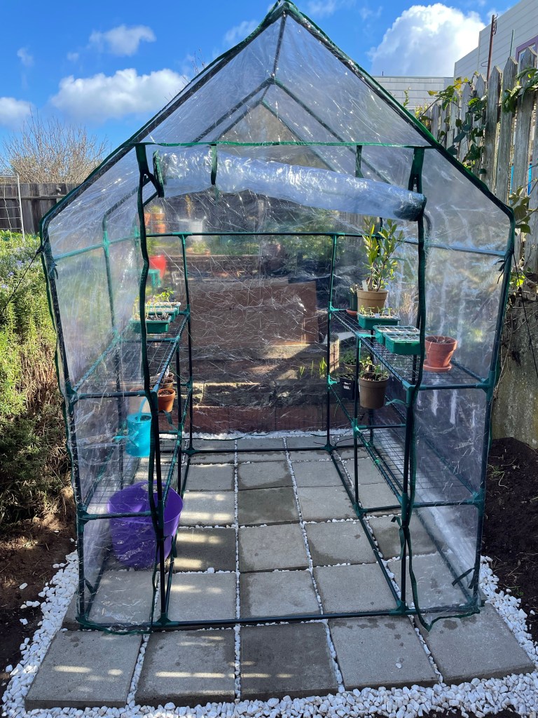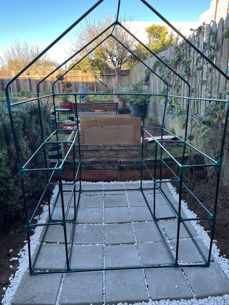 Took me a while to get the cover on- it was very windy the first day which didn’t stop me from construction, but did turn the greenhouse cover into a giant windsock so I had to wait till the next morning and get on a step ladder.