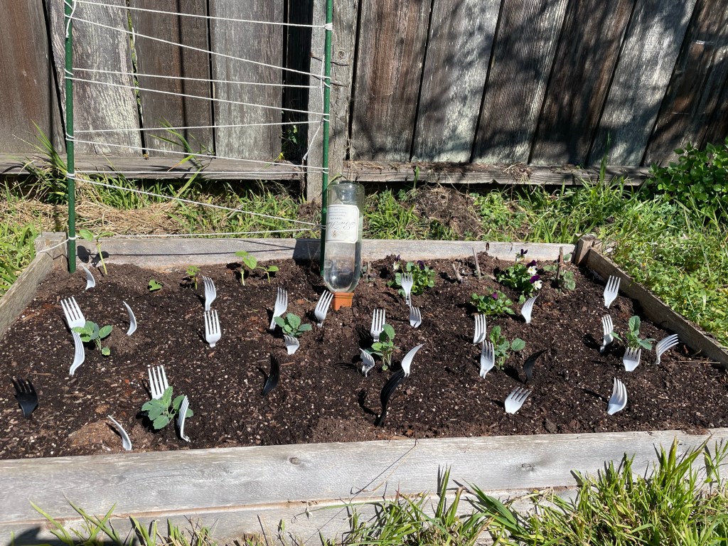 Those little pole beans in the back are now dead, because some local cats decided to dig them up and use their remains as a litter box. After re-forking the area heavily and straw mulching it, I replanted the beans by seed and hopefully they’ll get to live and not be shat upon.