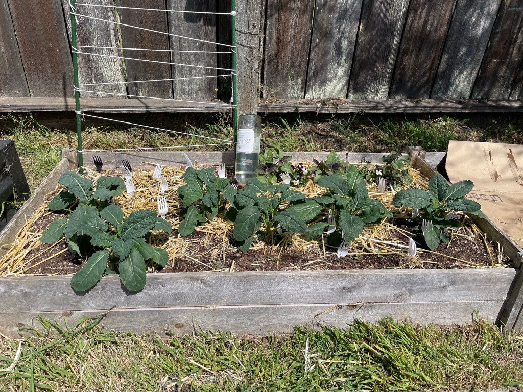 I’d already weeded and enriched the bed, as well as rescued some old agastache that had survived the winter. I also had started some pole beans in the new greenhouse, and put the last of my violas in the back. So I ripped up the card and sowed it, and then planted some kale. It all looked great, at first.