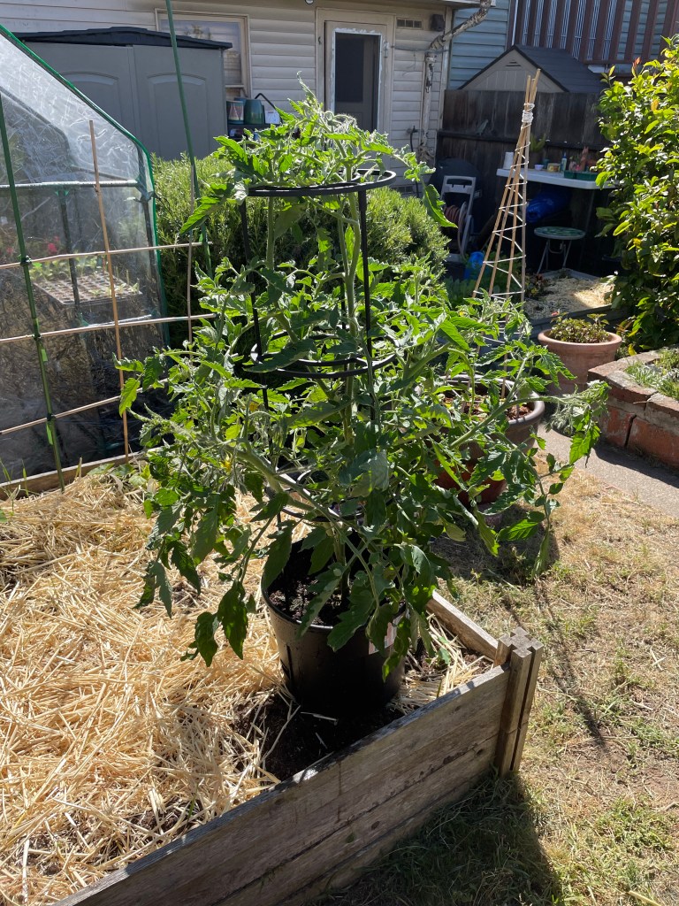 She’s too bushy-but tons of flowers. It was time for a trim- and to start better supporting the potential baby tomatoes. And while the greenhouse keeps the tomato to a happy temperature- it does nothing for pollination. So Big Baby Black Krim gets some outside holidays, usually to where I’ve been seeing the most bumble bees. Bumble bees are the best tomato pollinator- the buzzing they do helps shake the pollen out.
